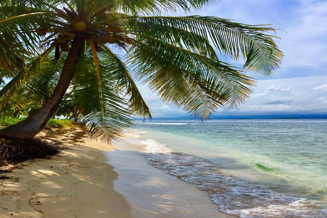 A large palm tree growing at the edge of a tropical sandy beach with a gentle surf | San Blas Islands