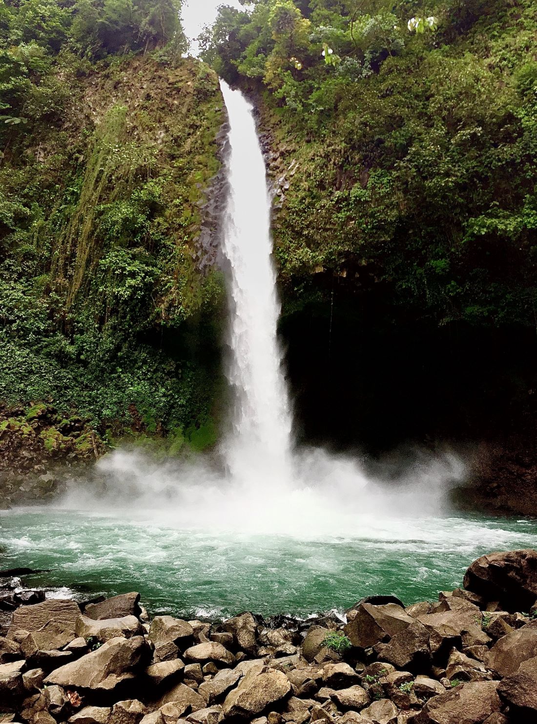 A narrow waterfall hits a small pond with mist rising up from below