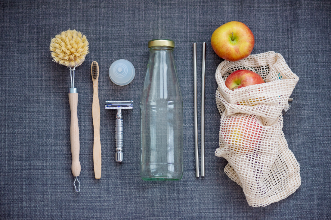 Here’s an easy step to take: Bring your own bags to the grocery and don’t buy plastic-wrapped produce (that one mystifies us!). Forgot your bags? Just load directly into the cart and then to your car.