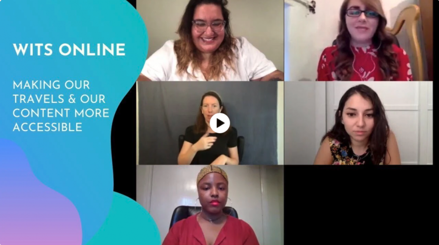 Screenshot from a virtual event WITS Online: Making Our Travels & Our Content More Accessible with 5 panelists visible