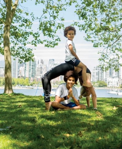 A trained yoga teacher, Jacob earned her 200-hour certification three years ago and has since completed training as a children’s yoga teacher. She’s originally from Munich, Germany, and has been a resident of Vancouver for 14 years. We caught up with Jacob to see what inspires her acrobatic yoga poses and to find out what insights she has for fellow parents.