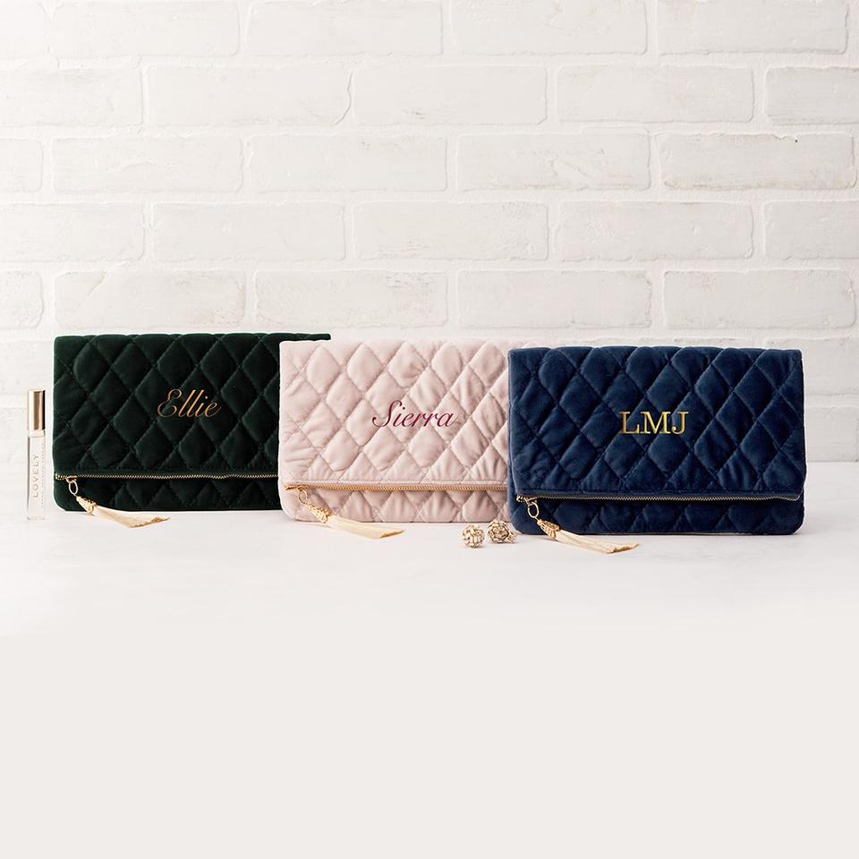 A stylish sidekick for your number-one sidekick. This fold-over clutch comes in three different colors and can be personalized with an embroidered monogram and 15 thread hues.