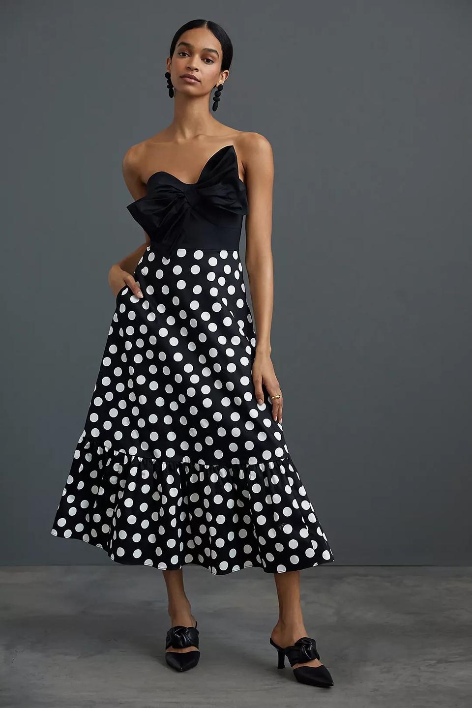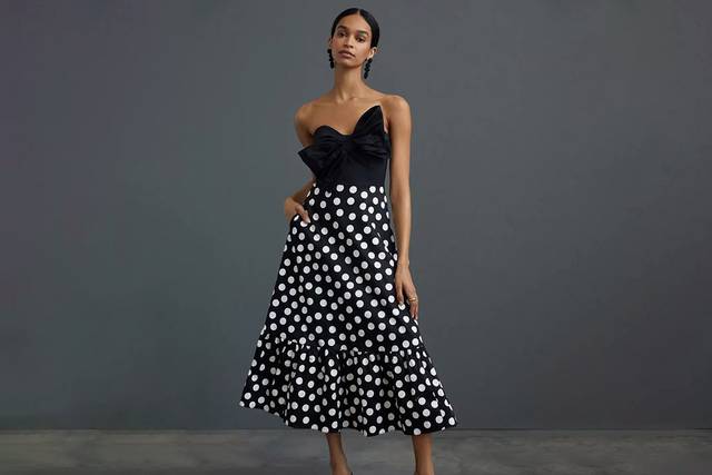 Bows and polka dots make for eye-catching details regardless of the party’s dress code. Along with a retro-style polka-dot print, this color-block midi dress has a bow-tie bodice and an A-line skirt with a flounced hem.