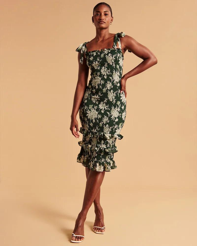 Romantic and playful, this midi dress is the epitome of boho chic. It comes in a pretty floral print, ruched bodice, square neckline, and delicate puff sleeves.