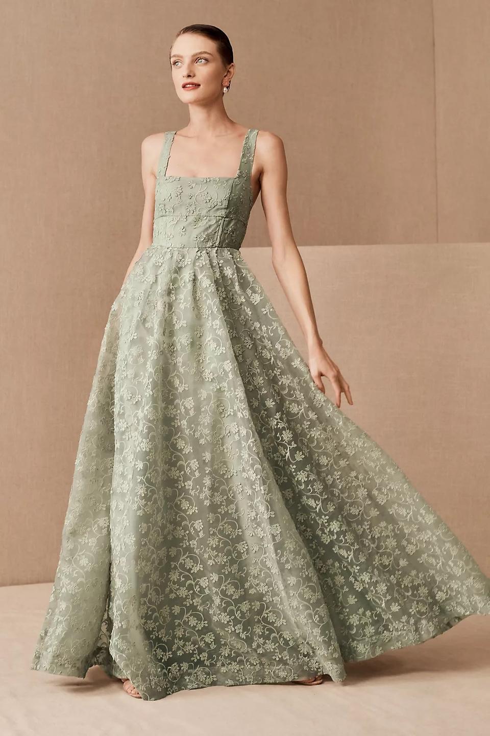 A black tie dress code calls for a formal gown like this beauty made from embroidered floral organza. The sleeveless bodice features an elegant square neckline and a low back.