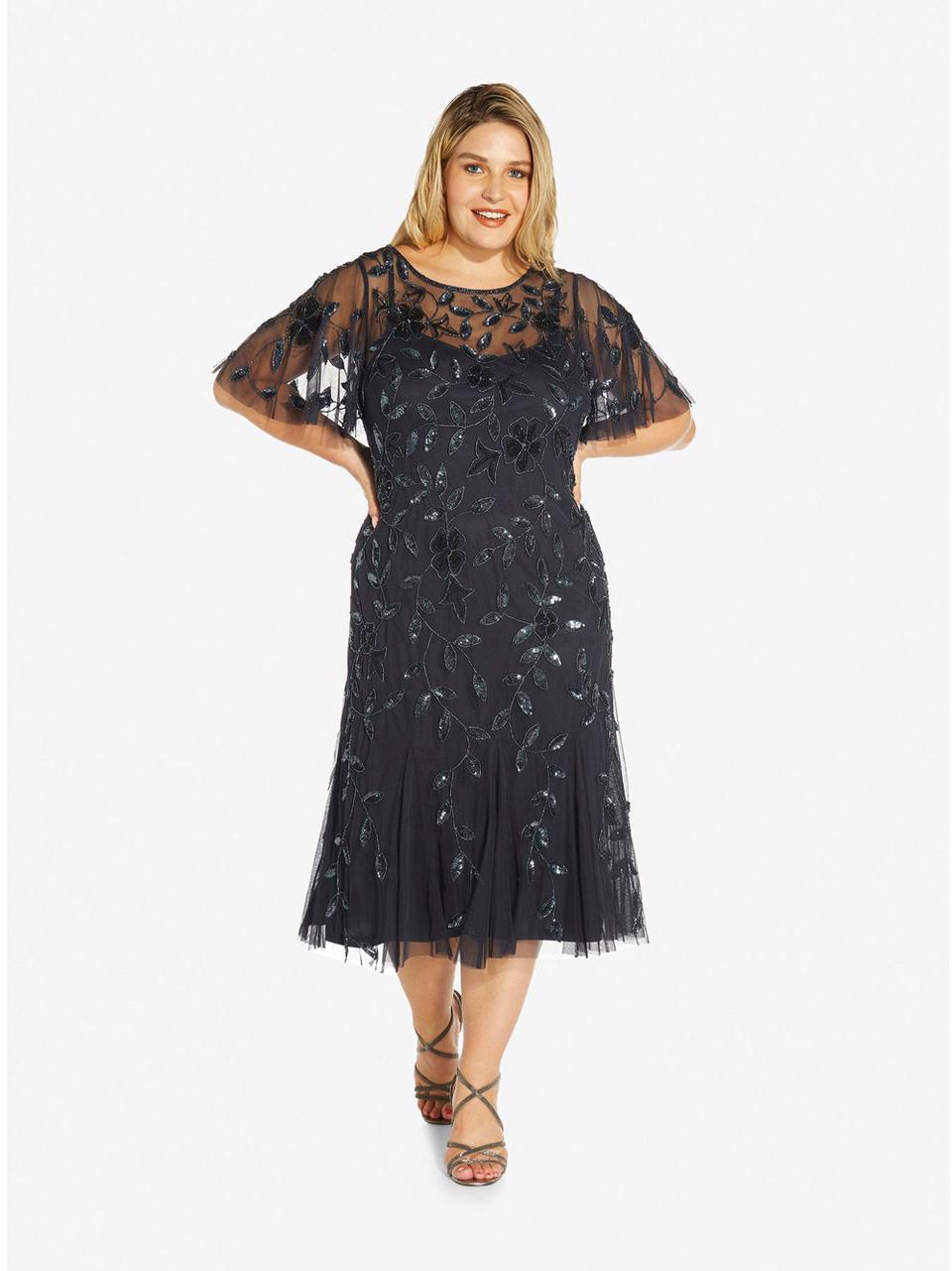 Flutter sleeves and beautiful hand-beaded detailing make this fit-and-flare dress an elegant engagement party outfit that could also work as a wedding guest dress. It has a demure illusion neckline and reaches the knee for a classic look.