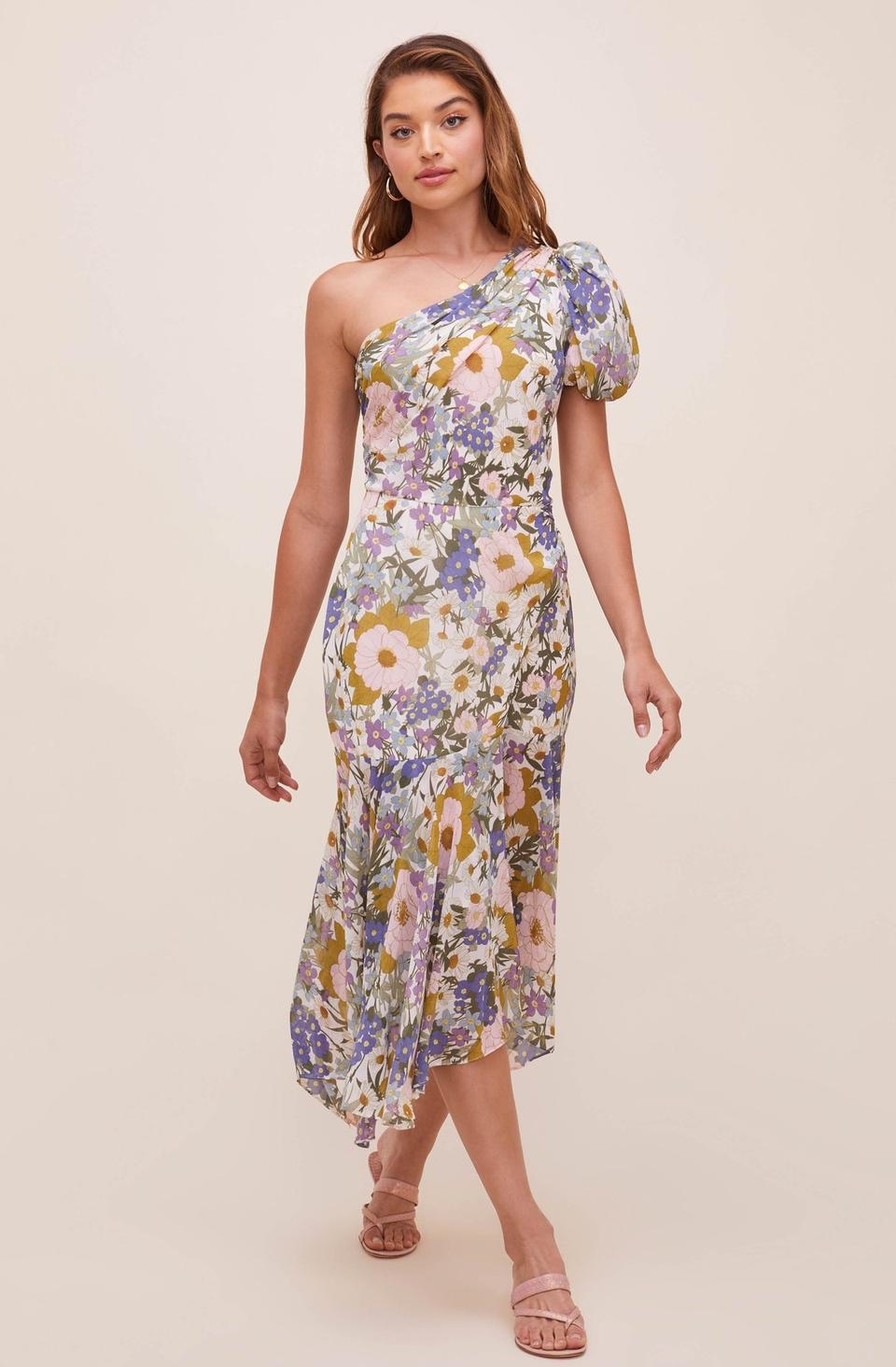 Whether it’s a summer engagement party or an early fall bridal shower you’re attending, this flowy dress was made to impress. The chic one-shoulder silhouette includes a puff sleeve, an asymmetrical ruffle hemline, and a vintage-inspired floral print.