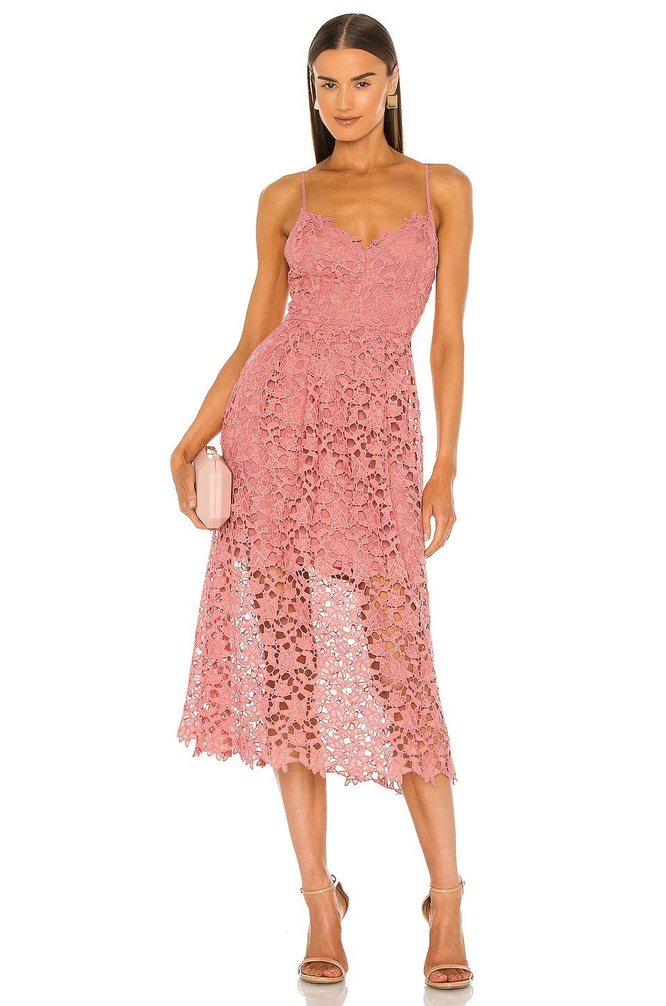 Available in six statement colors, this chiffon midi dress features a pleated flowy skirt that reaches below the knee. It’s an elegant engagement party dress for a guest that’s easily re-wearable.
