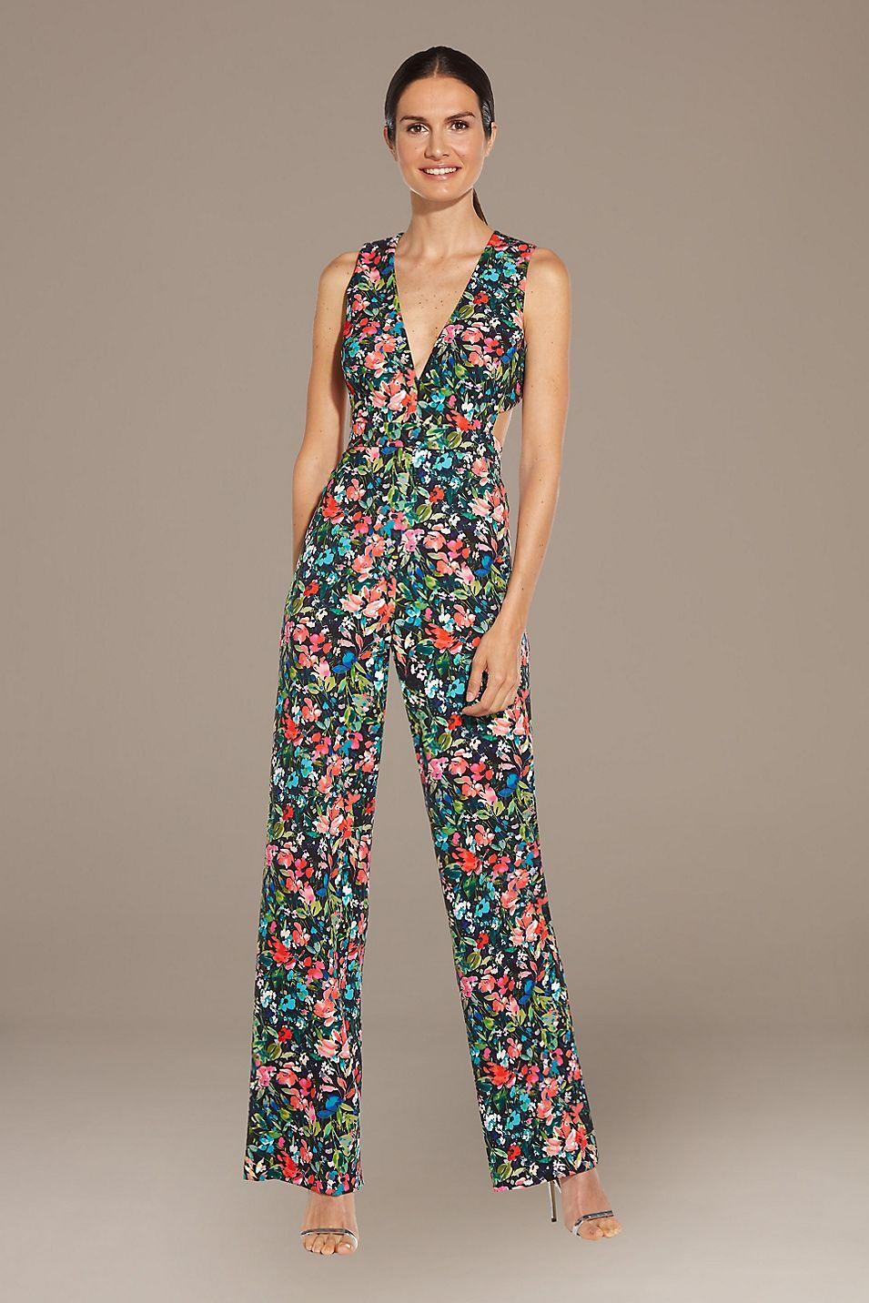 A colorful jumpsuit is a great alternative to traditional engagement party dresses for guests, especially for a casual event. This fun style has an allover floral print and cutout back—pair it with dressy sandals to elevate the overall look.