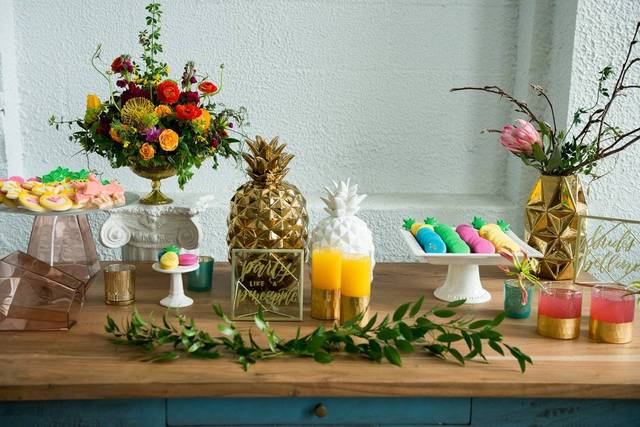 Take your pre-wedding festivities poolside with a tropical bridal shower theme idea. Set the scene with exotic plants (monstera leaf or colorful orchids are excellent picks), bright colors, sassy flamingos, and golden pineapples galore. Keep the mood light and fun with beach party playlist, and ensure your guests stay properly hydrated with an array of fruit-infused sips or DIY mojito bar.