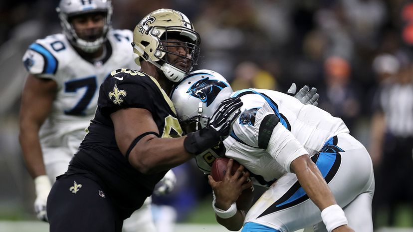 CTE, concussion, NFL“Carolina Panthers’ QB Cam Newton was hit so hard by New Orleans Saints’ defensive tackle David Onyemata during the Jan. 7, 2018 NFL Wildcard game that he sat dazed on the field for several minutes, though he was not pulled from the game. Photo by Chris Graythen/Getty Images
