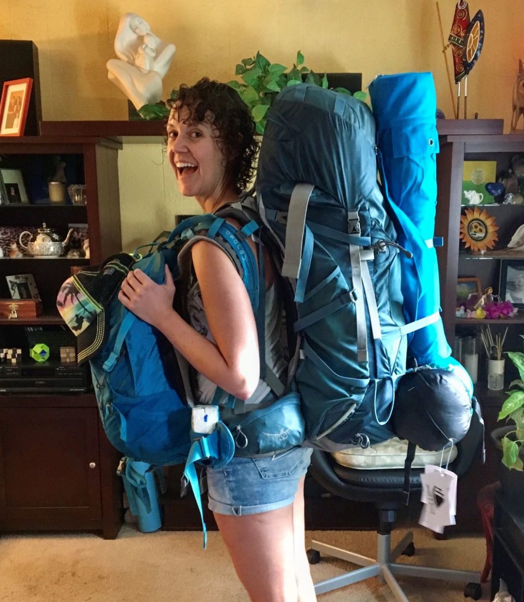 Amber Parle with two large backpacks ready for a trip