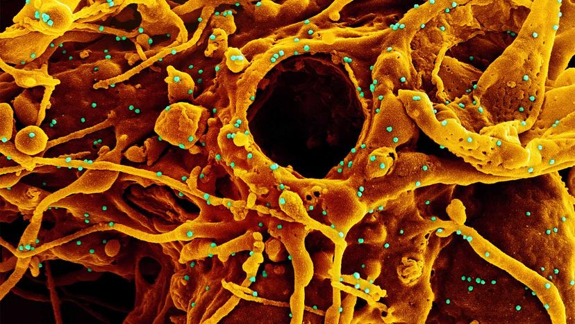 B.1.1.7 variant“This colorized scanning electron micrograph shows a cell (orange) infected with U.K. B.1.1.7 variant SARS-CoV-2 virus particles (green) isolated from a patient sample. B.1.1.7 variant is estimated to be between 40 and 80 percent more transmissible than the wild type. NIAID