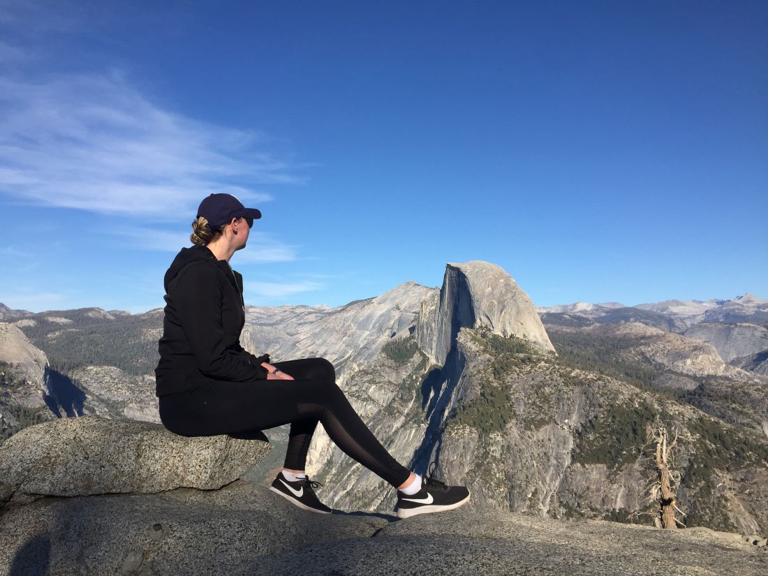 Caitlin Burns sits on a rocky summit at Glacier Point in Yosemite National Park