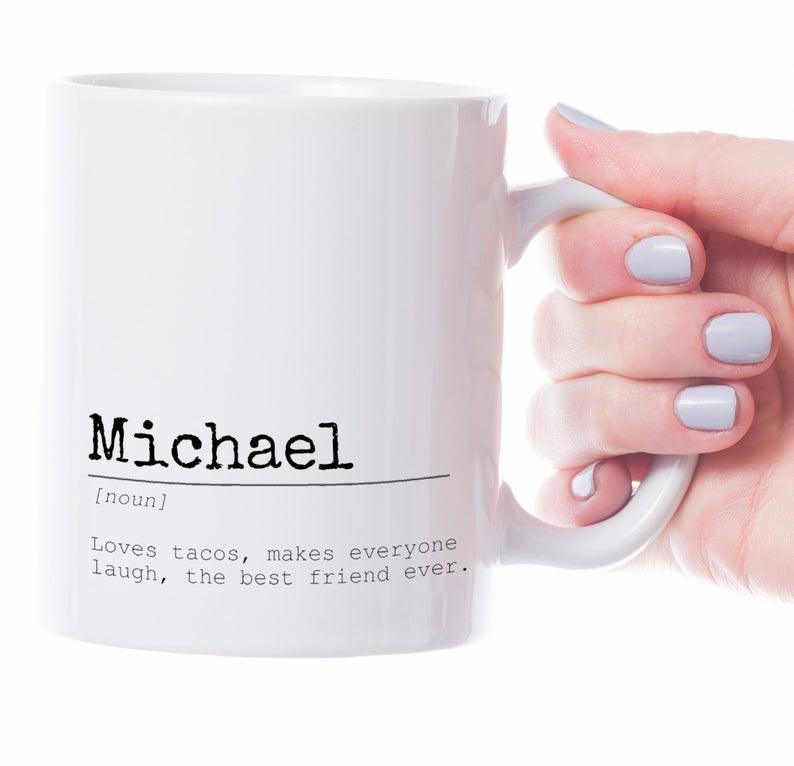 Even if you haven’t been dating for a while, you probably know enough about your partner to provide a few details for this super-cute personalized mug.