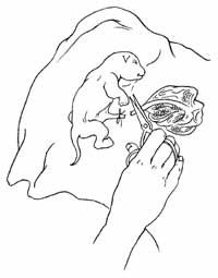Step 6c: Using your other hand to secure the kitten, lift your hands to head level and swing firmly down toward the floor. Repeat several times.