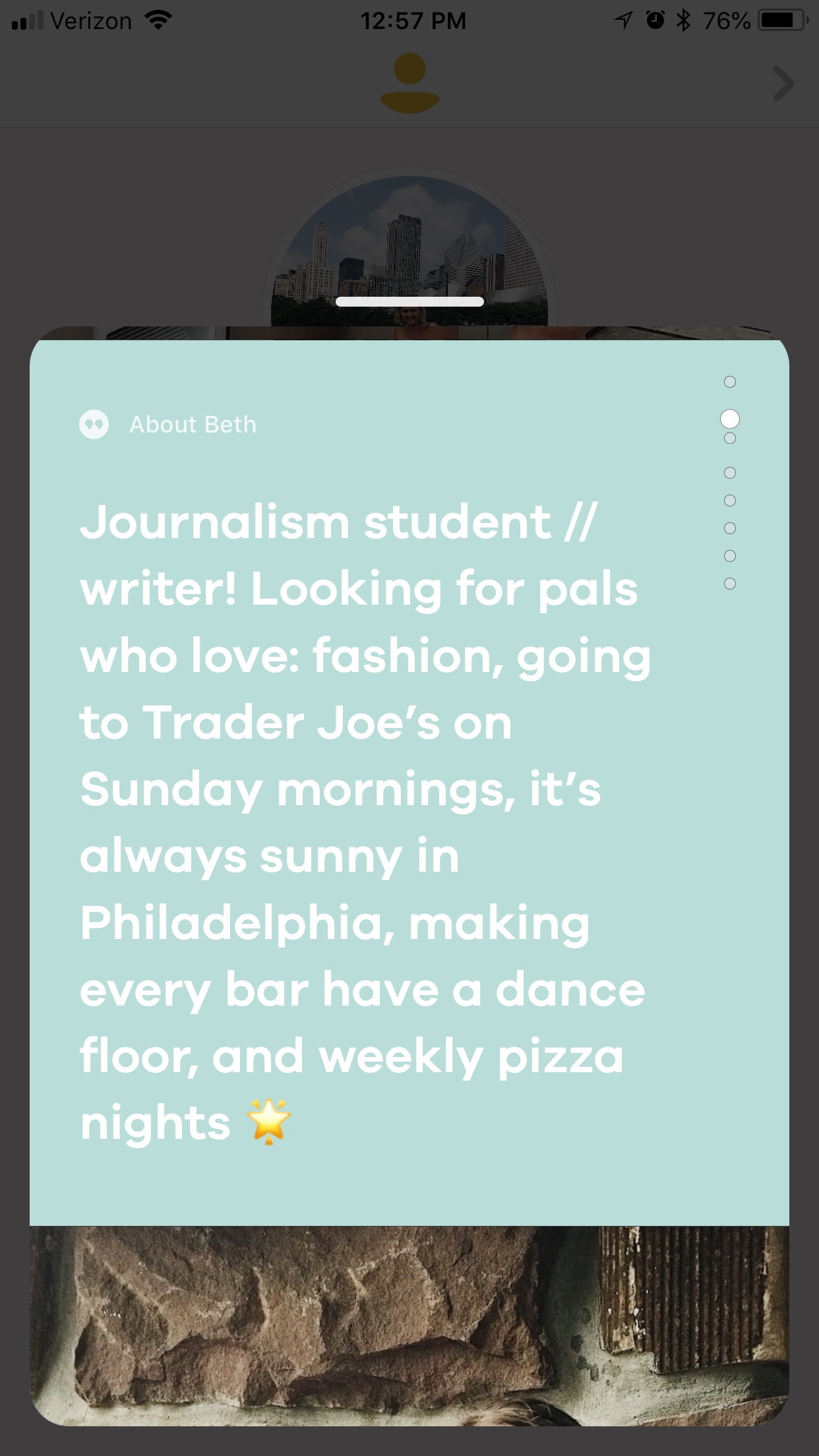 Creating a unique bio that describes what you really want out of these friendships is a lot harder than I expected. Everyone wants a workout buddy who will always get brunch after, someone to watch The Bachelor with, and someone to be the Jess to their Cece—myself included! It’s hard to not sound basic and like everyone else when you truly do want all of those things.