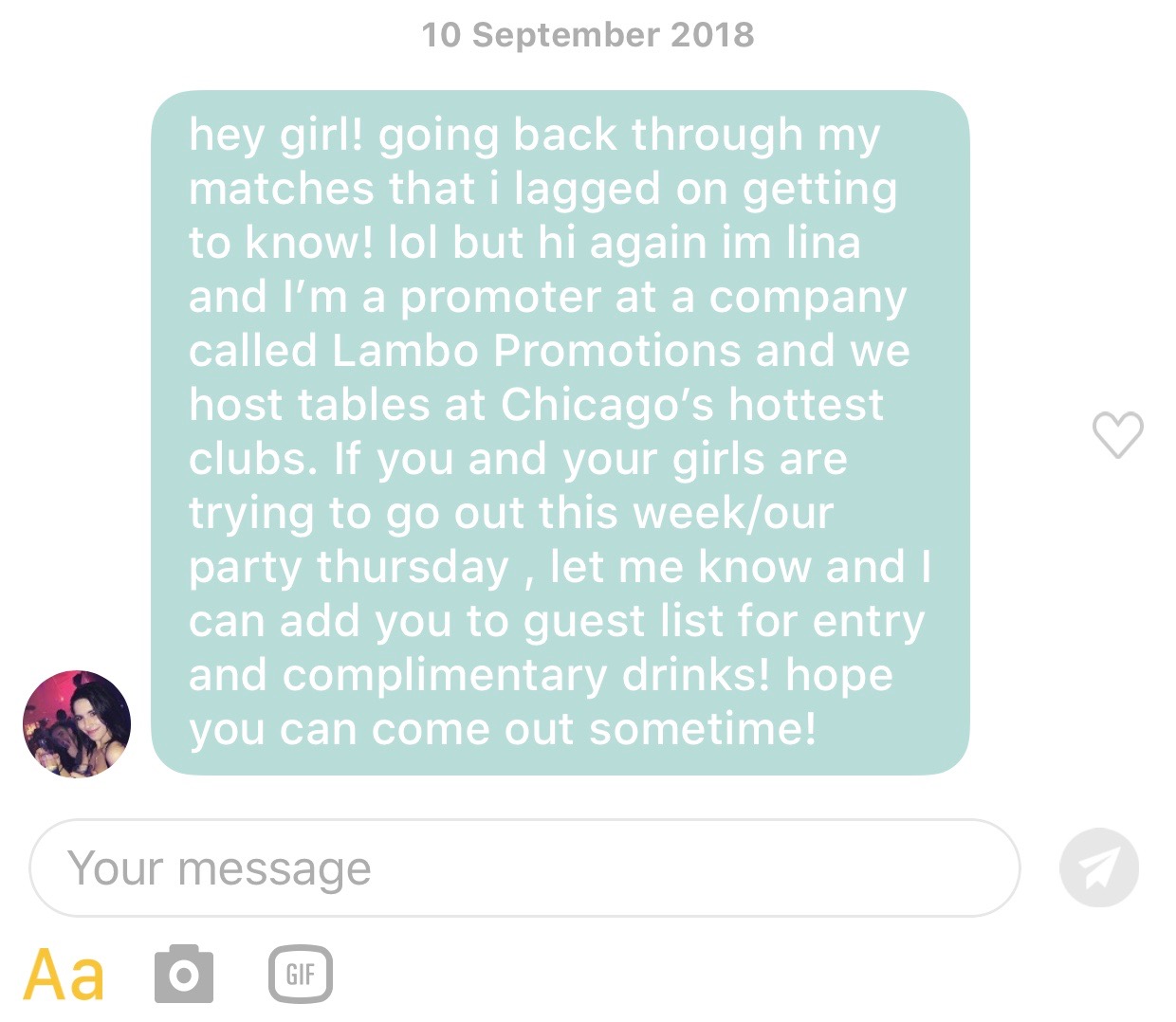 I noticed a lot of my matches were looking for roommates or were promoters at clubs and wanted me to “get a group of girls together” for a free table and drinks. While I am always down for a free table and drinks, I feel like if I already had a “group of girls,” I probably wouldn’t be on Bumble BFF. Maybe just me though!