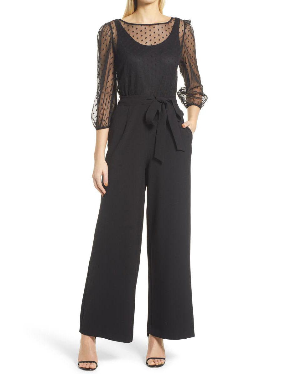 Jumpsuits are having a moment, and this classy black jumpsuit certainly fits the bill for a special occasion. It may not be traditional cocktail attire, but this rehearsal dinner outfit might just make you the best-dressed guest. The sheer polka-dot sleeves and neckline add a unique but subtle detail. To complete the ensemble, choose a pair of black or nude heels and a matching clutch.