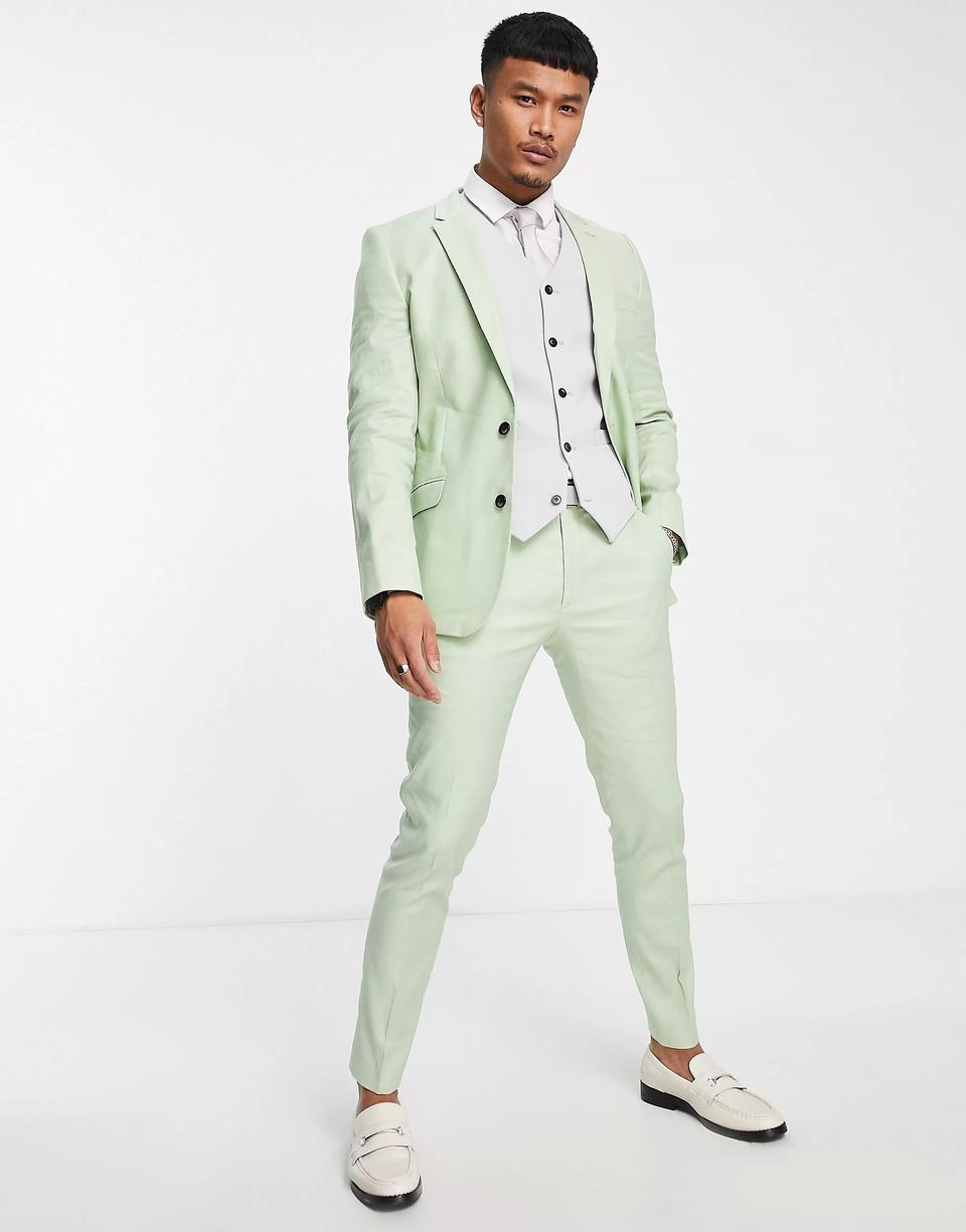 Believe it or not, ASOS is a great place to shop for men’s rehearsal dinner attire. This snazzy pale green suit can be purchased as separates or as a co-ord depending on the style you’re going for. Opt for the jacket, pants, and vest if it’s a formal rehearsal dinner. For casual celebrations, remove the vest and swap out a dress shirt for a plain white tee.