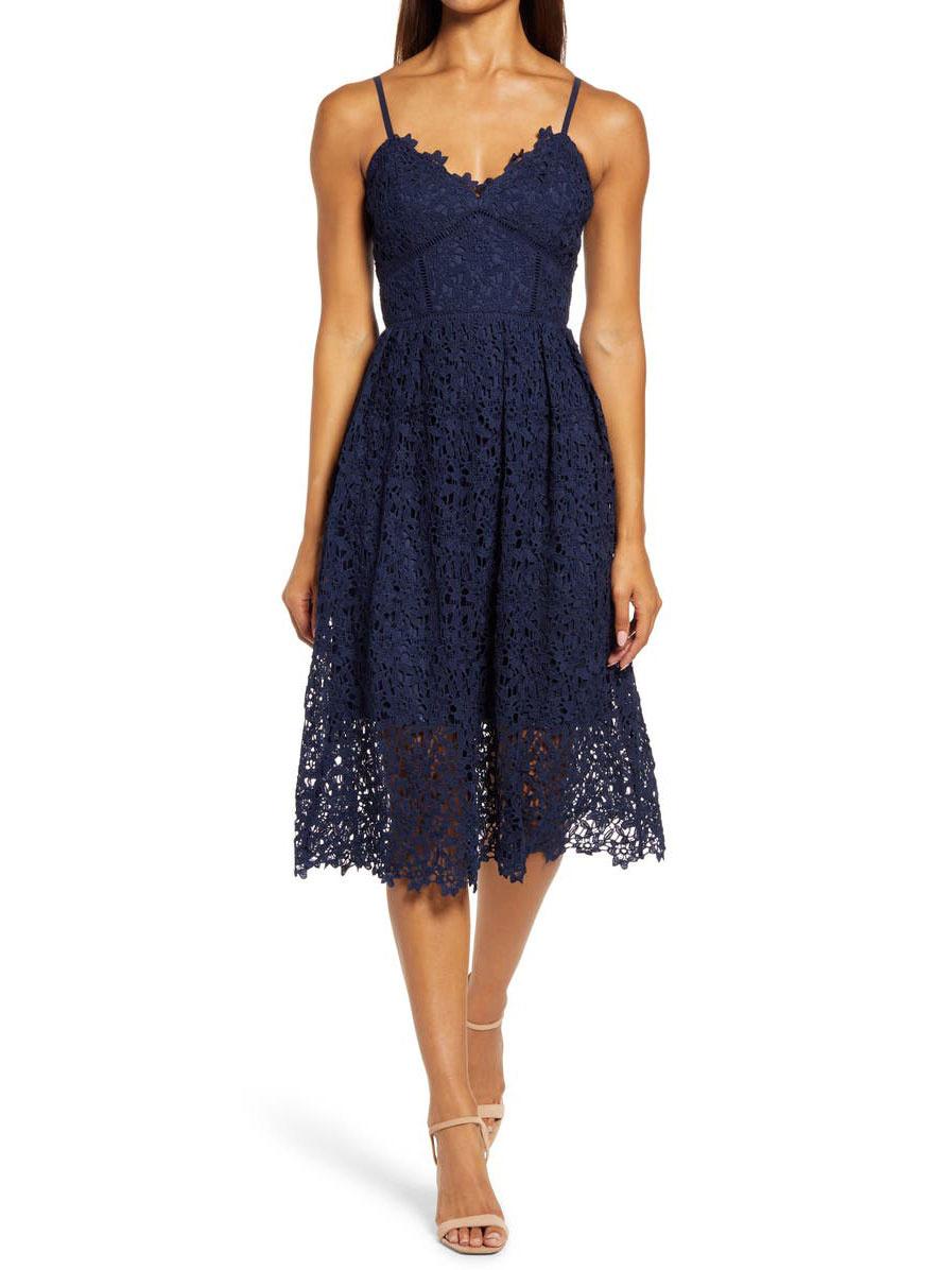 If the wedding is black tie, then assume that the rehearsal dinner requires semi-formal or cocktail attire at minimum. This lace cocktail dress is a good pick for fancier celebrations. Plus, the versatile navy color makes it a trendy rehearsal dinner outfit for a guest year-round.