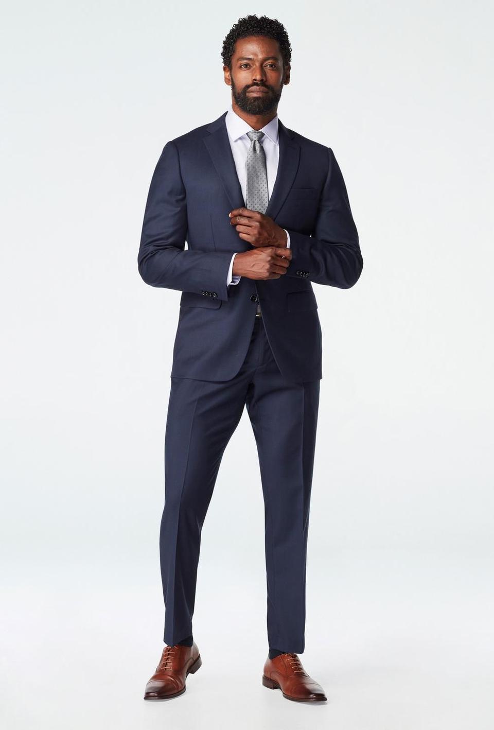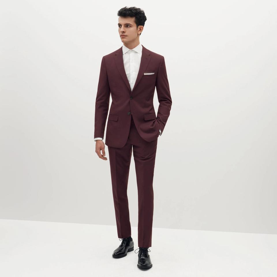 A light gray or blue suit looks the part for spring and summer, but what about fall and winter? Enter: this burgundy two-piece from SuitShop. Polished black dress shoes and a plain white shirt are all you need to pull this look together.