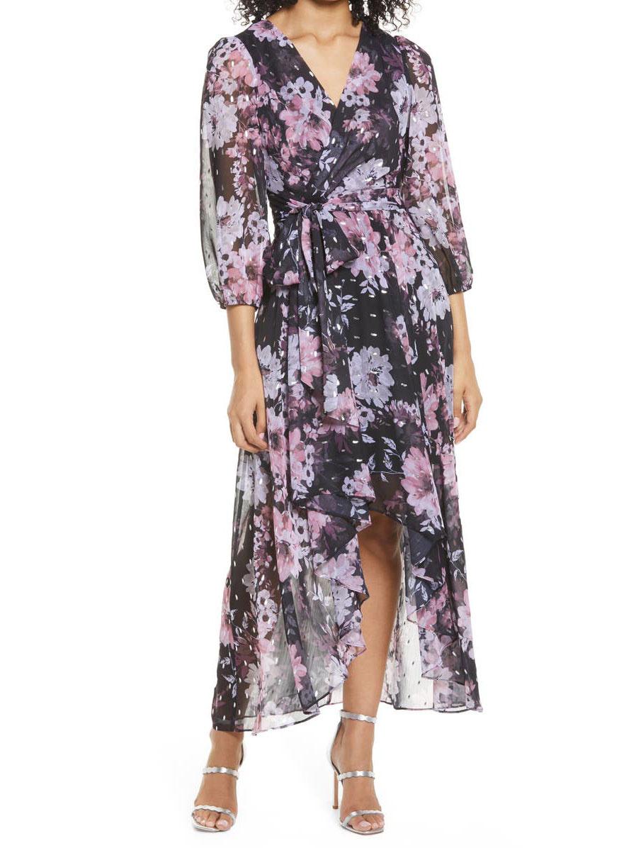 Romantic shades of purple and floral patterns are a match made in heaven. This gorgeous midi will look just as stunning dressed up with heels for a cocktail party as it will when matched with a comfy pair of sandals in the couple’s backyard. That said, the airy material and playful hemline feel most apt for a garden setting.