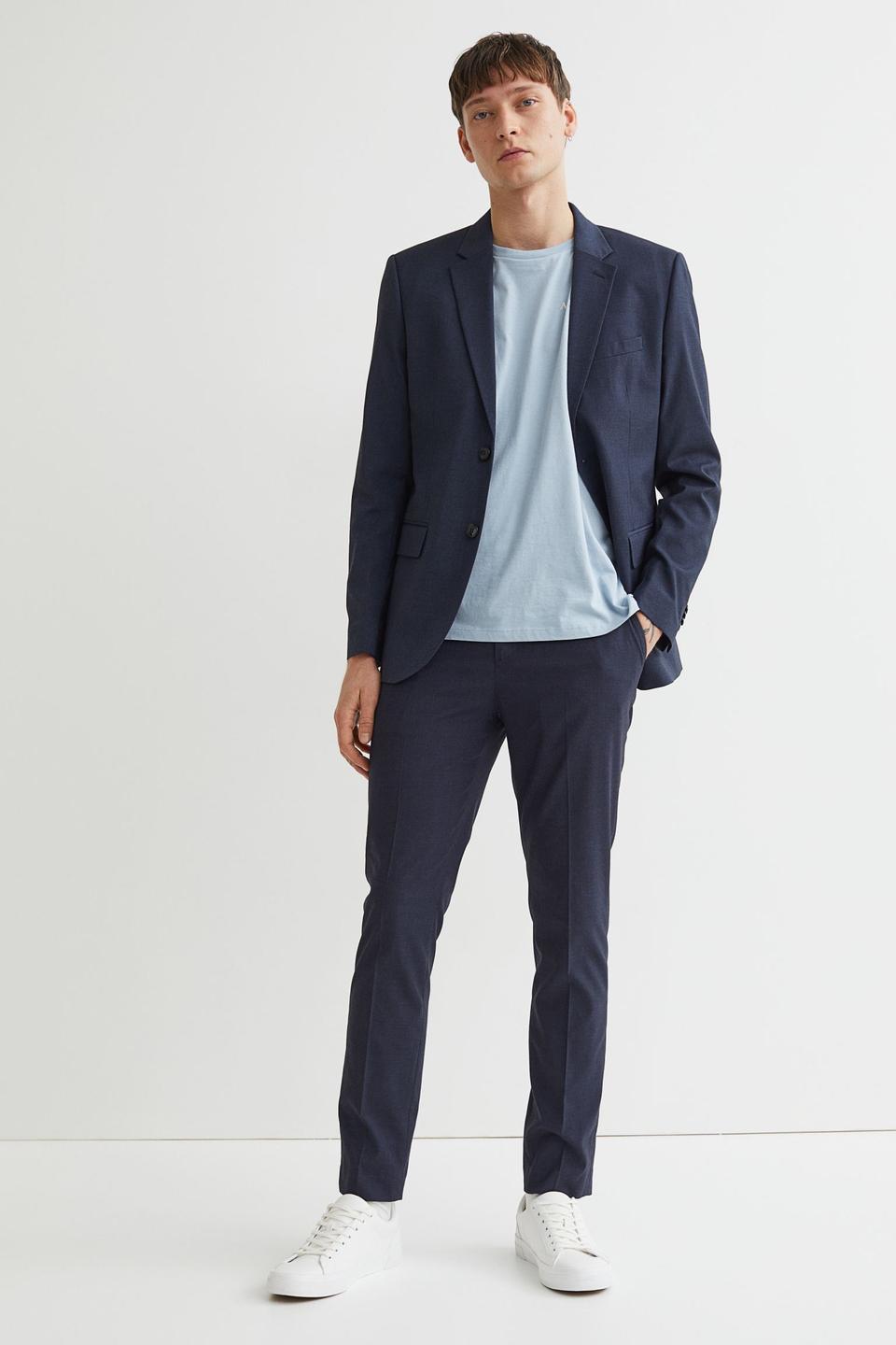How’s this for a casual rehearsal dinner outfit for a guest? Slim-fit pants feel more put together than loose or baggy dress trousers. Similarly, a slim-fit blazer adds a subtly sharp touch to any T-shirt-and-pants combo. An athletic-inspired dress shoe will be a really on-trend finishing touch.