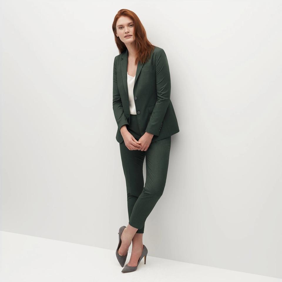 If dresses and jumpsuits aren’t your thing, try this suave two-piece suit in an earthy shade of green. Just like men’s rehearsal dinner outfits, you can dress it down with a plain white tee for a casual affair or elevate the look with a satin blouse and nude heels for a formal event.