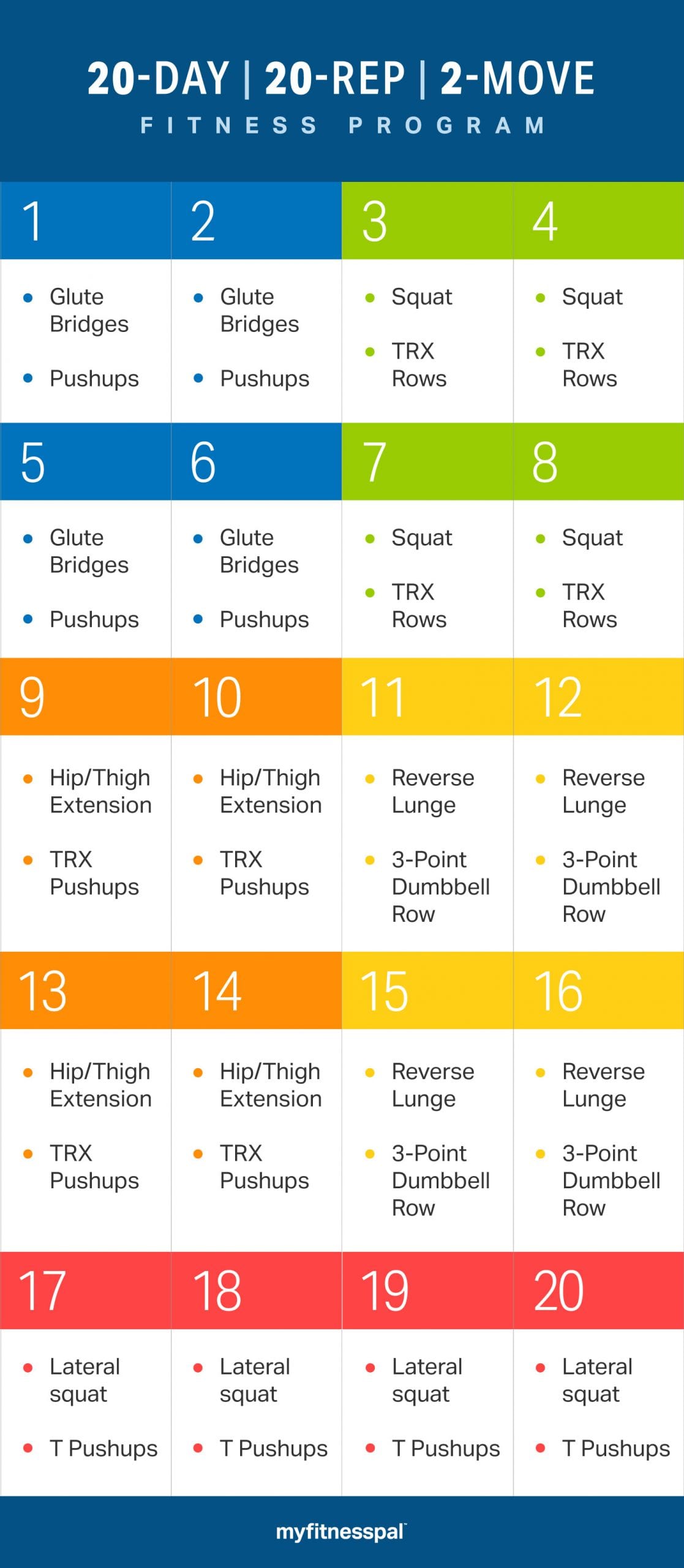 Each day for 20 days, you’ll do 20 reps of two exercises. Even better, you’ll only have to keep track of 10 basic exercises — but this rotation of moves helps you target more body parts and muscle groups while giving others a break. The best part is it doesn’t take a lot of time so it’s relatively easy to commit to — and, for that reason, it’s super effective.