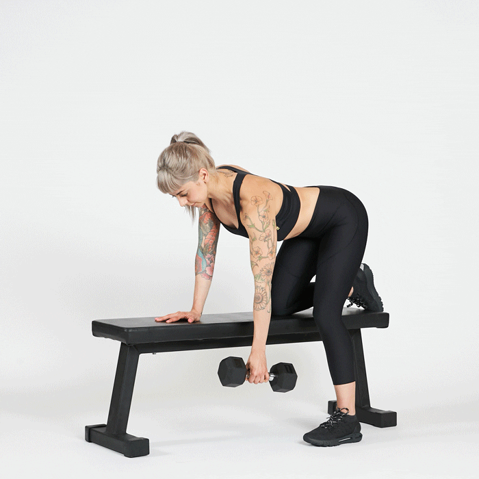 The move: Facing a bench with your right hand and right knee on the bench and torso parallel to the ground, grab a dumbbell with your left hand, squeeze your shoulder blades, and pull your elbow by your ribs and back into a row. Do 10 reps and switch sides.