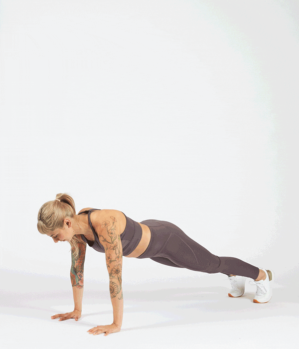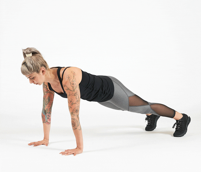 The move: Get in a straight-arm plank position with your hands about shoulder-width apart. Keep your lower back flat and don’t let your hips sag. Lower yourself and keep your elbows close to your body as you descend, with your chin lifted. Push back up to the starting position.