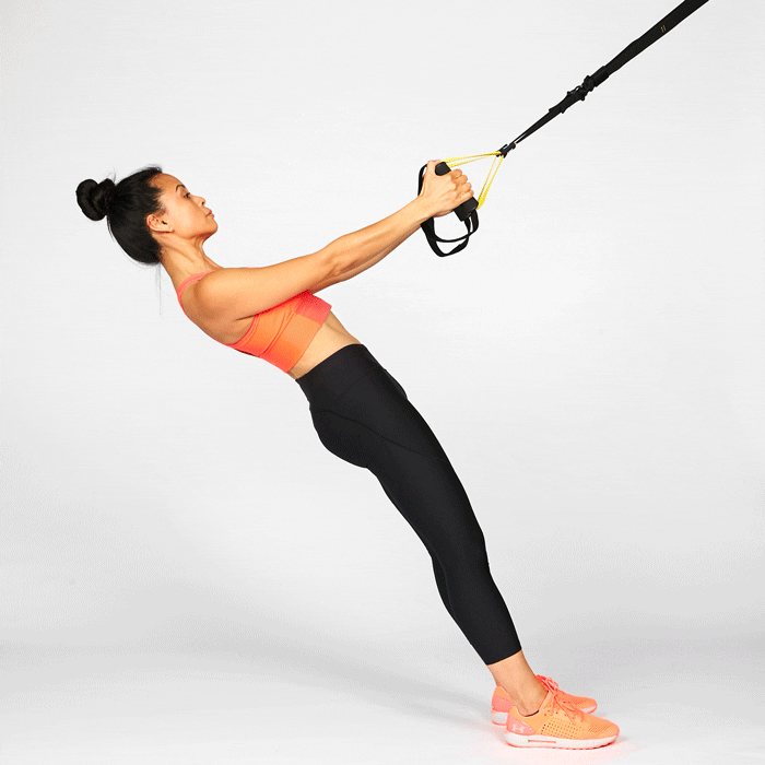 The move: Grab the TRX straps from underneath with your feet closer to the anchor point. Squeeze your shoulder blades together and pull yourself up while keeping your body straight like a plank.
