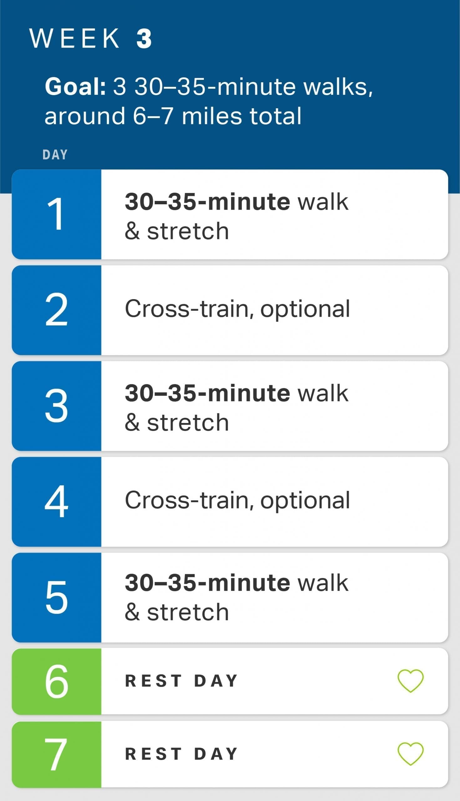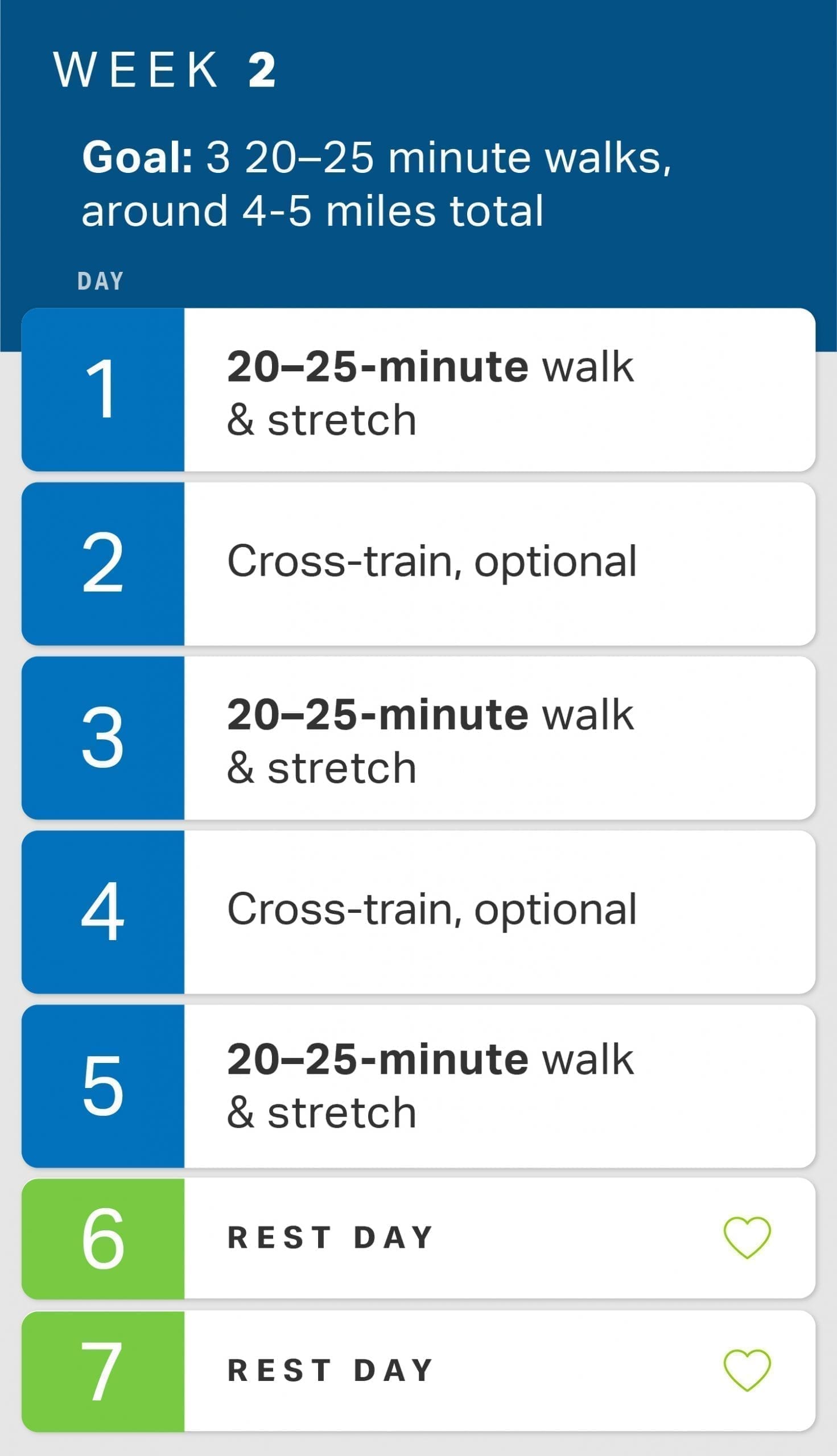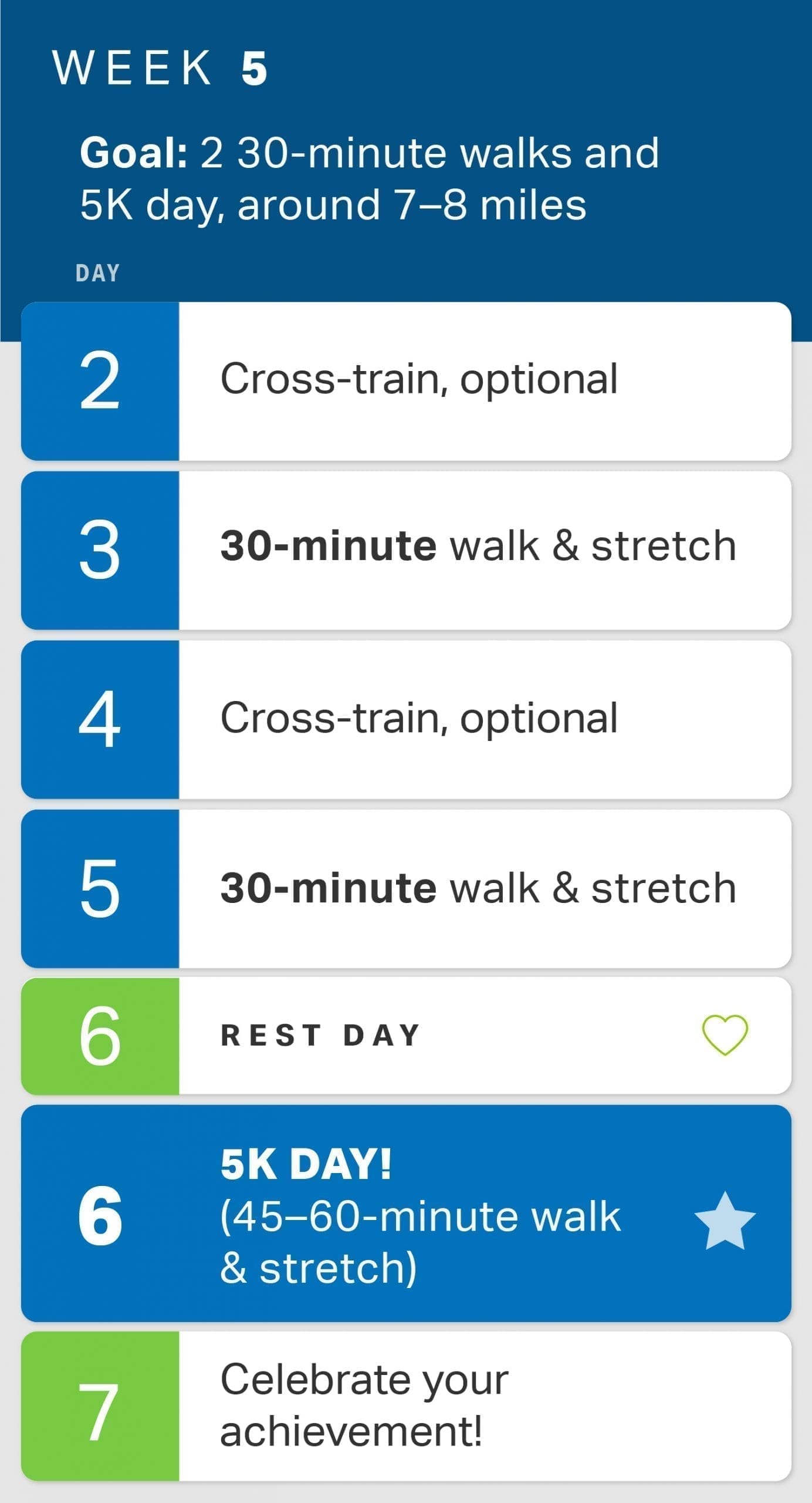 With this walking guide, you’ll safely and gradually progress from little-to-no regular exercise to a 5K (approximately 3.1 miles) walk. Or, if you have already been exercising, but are ready to take things to the next level, you can adapt the plan by jumping ahead to week two or three. While there isn’t a time requirement to finish, you may want to set a personal time goal such as 45–60 minutes.