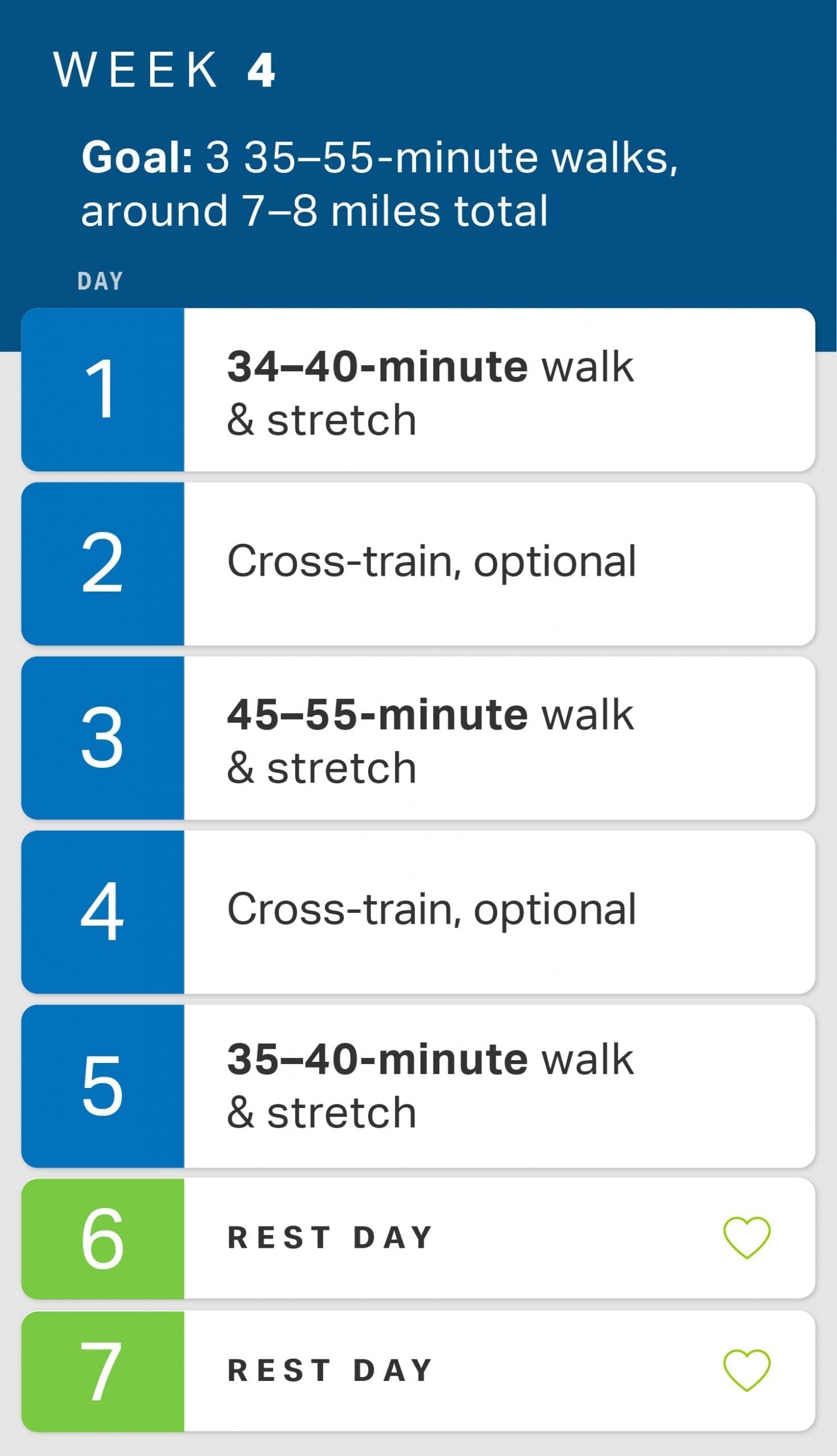 On average, walking briskly means you’d complete 1 mile in about 15 minutes — and that’s the general range this plan uses (and how we’ve calculated approximate weekly mileage). You may find you need more time to complete a mile (especially in the beginning) and that’s perfectly fine. There’s no speed requirement for the suggested timed walks in this plan, so while you may need to start out at a more gradual pace, you also want to focus on picking up your pace a little each week or each walk. Improving your time per mile is a great way to gauge your progress as your fitness level improves with consistent training.