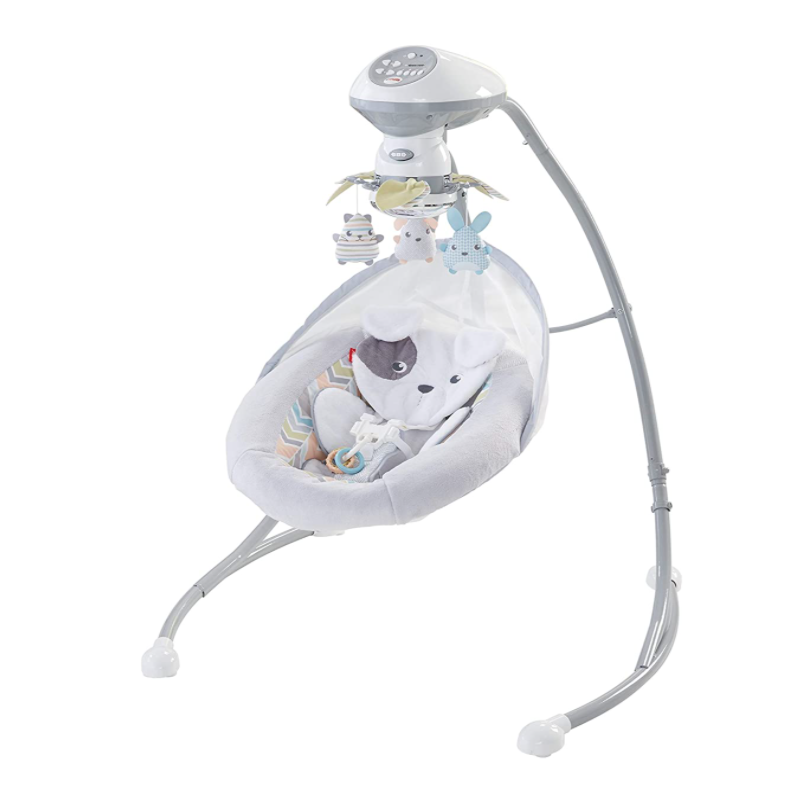 No matter how your little one likes to swing, this one aims to please the most finicky baby. Gentle motion rocks tots from side to side or head to toe, while a trio of playful pups dance and sway overhead for extra amusement. You’ll also love the soft machine-washable seat pad and six swinging speeds.
