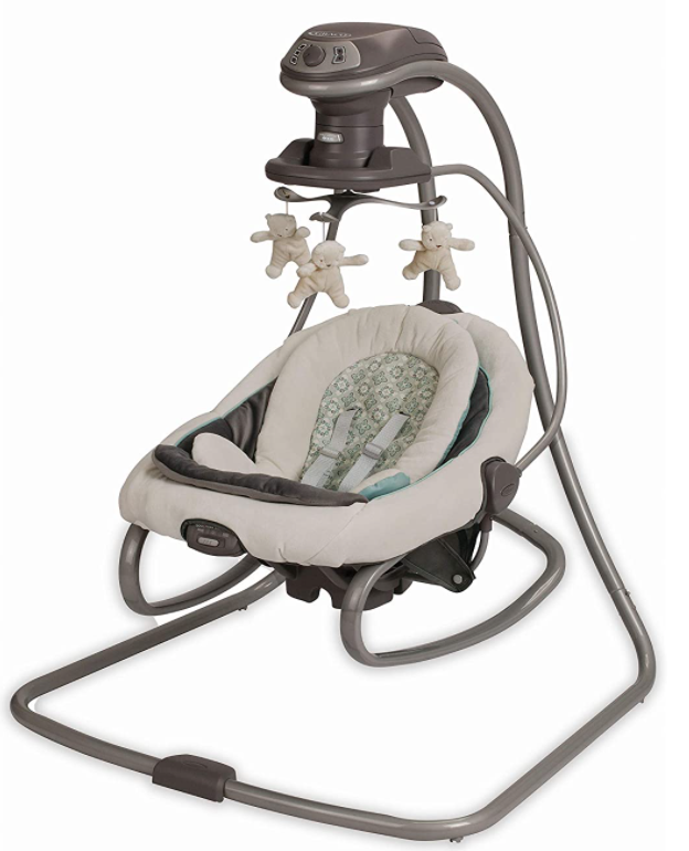 With 15 songs and sounds, 18 soothing motion options, and two vibration speeds, this functional baby swing is incredibly versatile. Three overhead toys also add hours of enjoyment. And perhaps the best part: the seat can be removed and used as a rocker.
