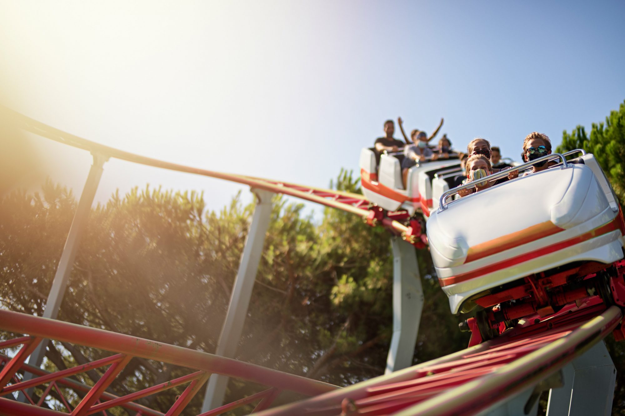 An image of people on a rollercoaster with masks on.
