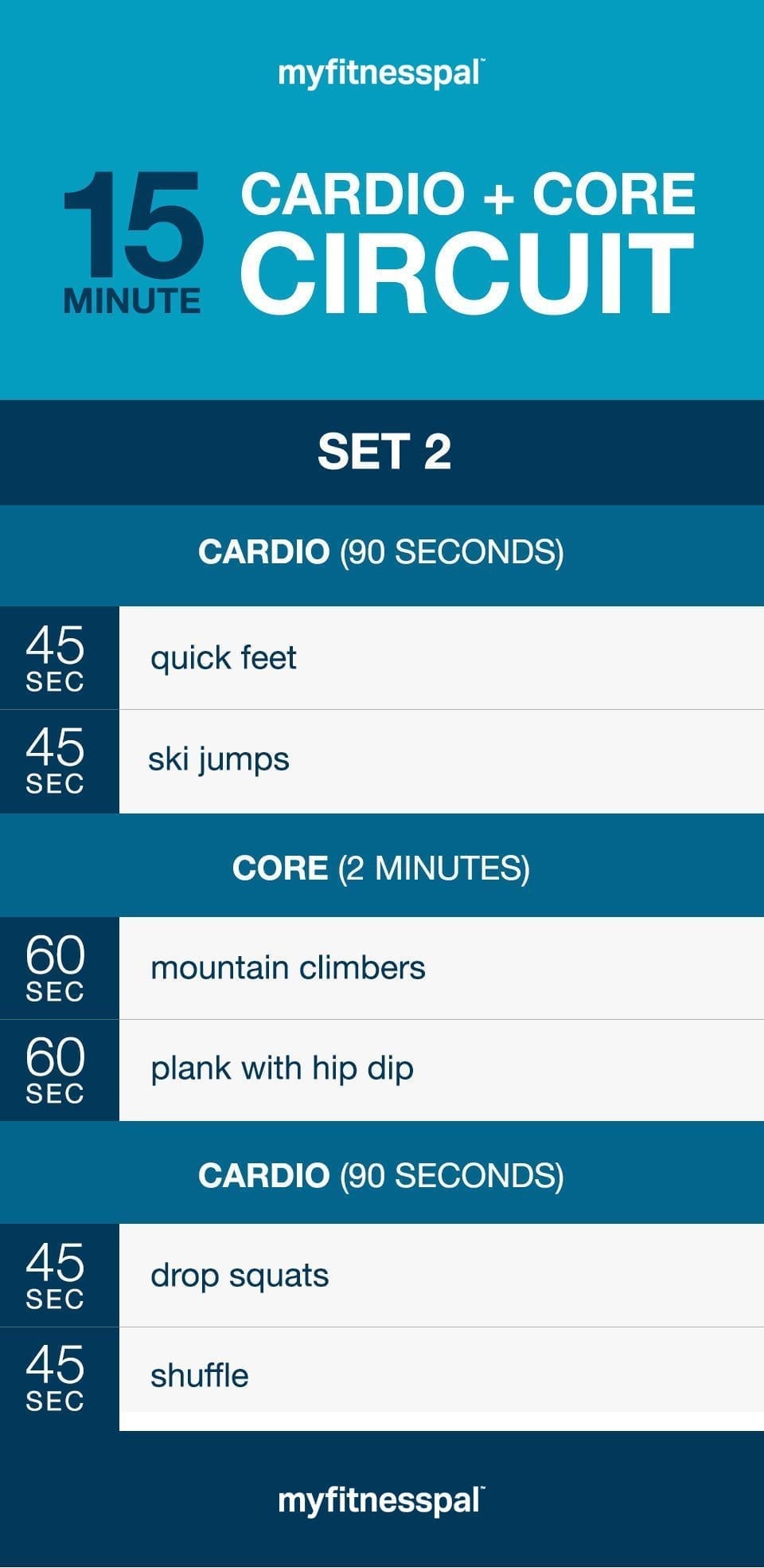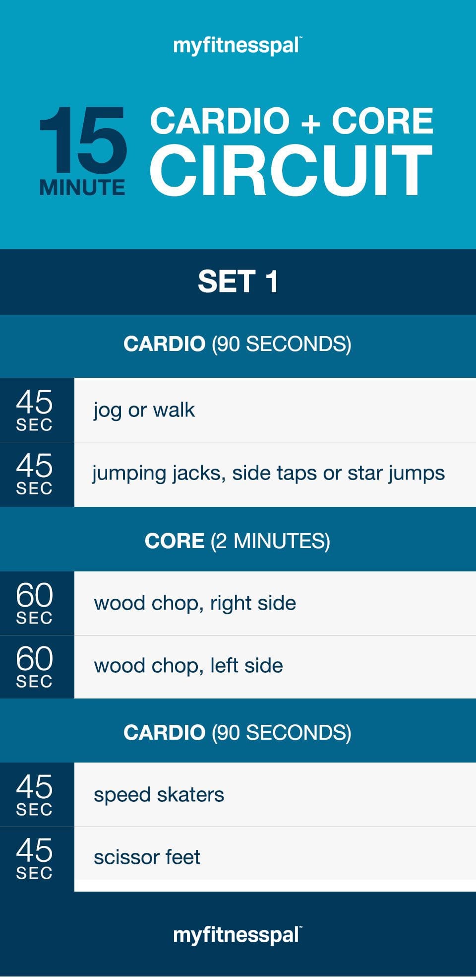 This time around, we’ve got a combination cardio and core workout that also takes only 15 minutes, is easy to do and, best of all, requires no equipment.