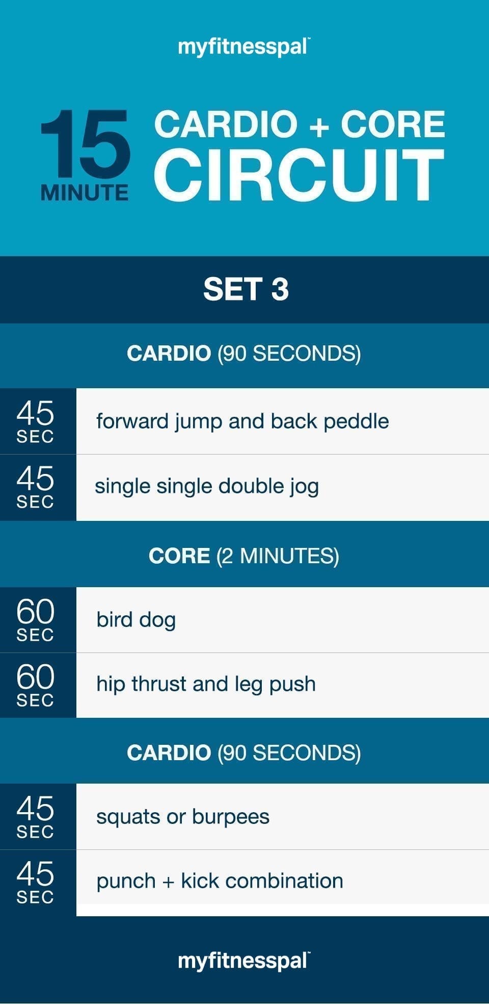 For the cardio portion, set your timer for 45 seconds, then repeat, for 90 seconds of total work. For the core portion, set it for 60 seconds of work and 10 seconds of recovery, then repeat.