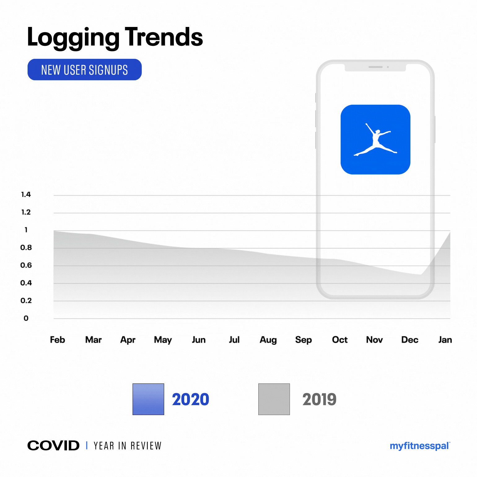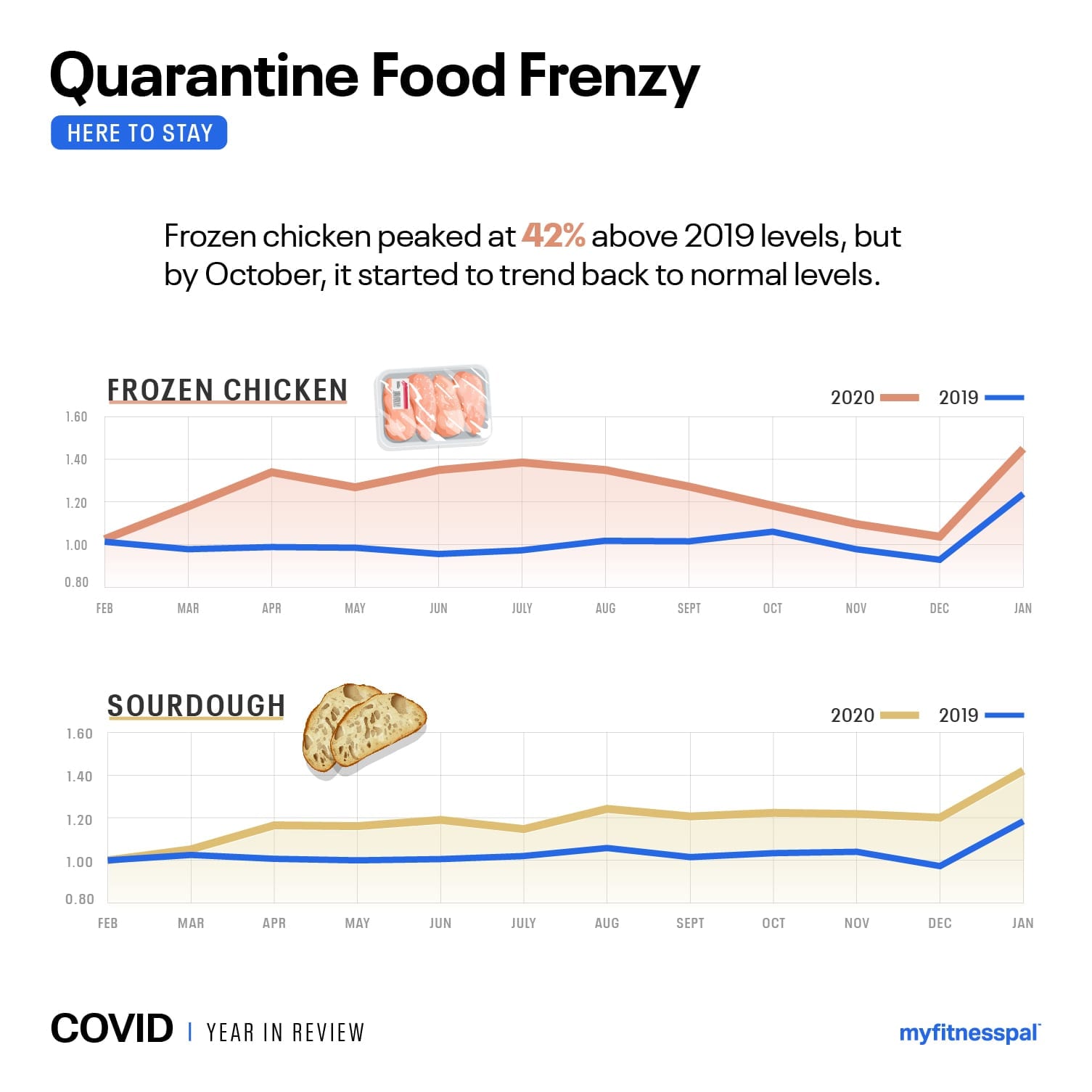 However, some trends have staying power. We’re still logging foods like sourdough bread, canned tuna and frozen chicken more than in pre-COVID days. Already a top-logged food, frozen chicken peaked at 42% in July above 2019 levels, but by October, it started to trend back to normal levels.