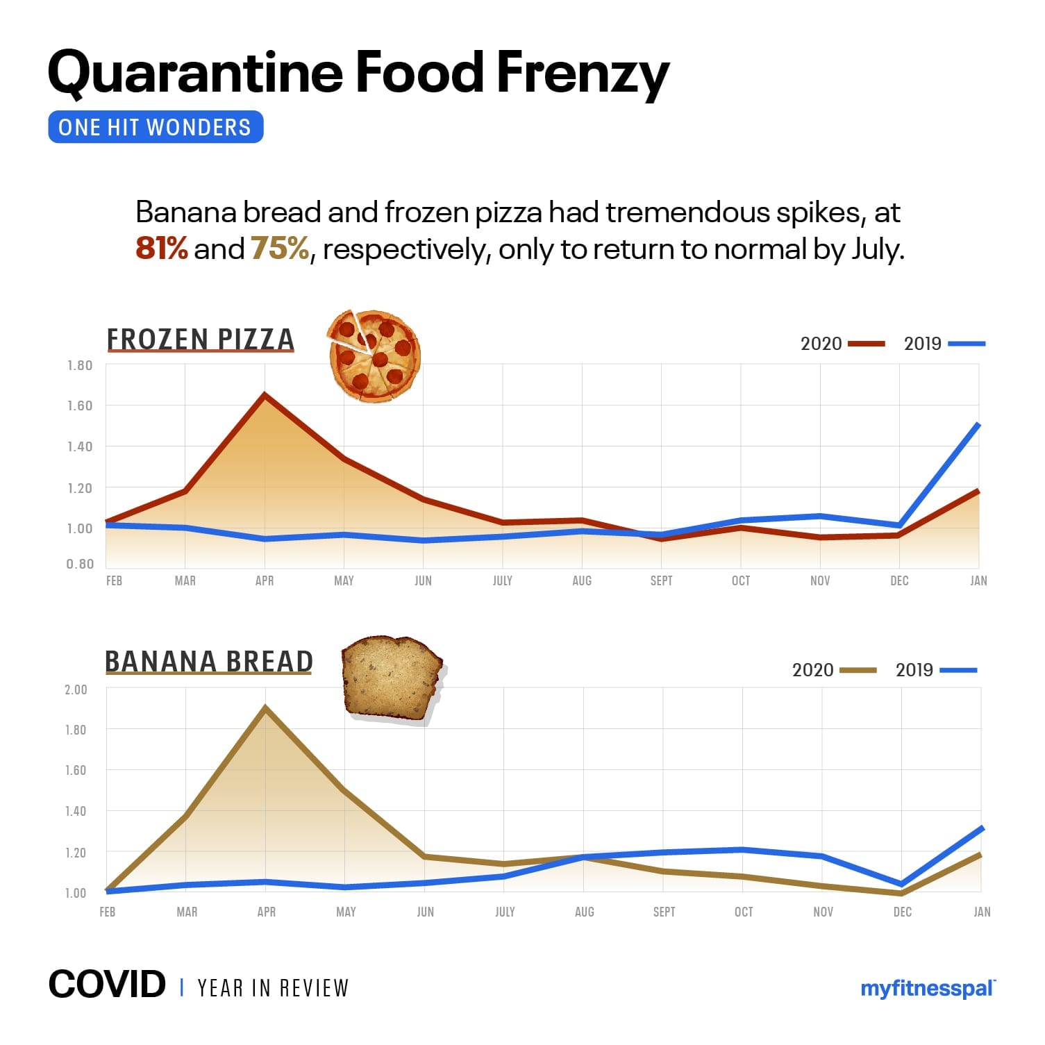 On the other hand, banana bread and frozen pizza had tremendous spikes above 2019 levels in April, at 81% and 75%, respectively, only to return to normal by July.