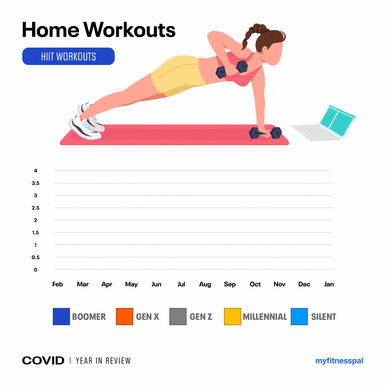 HIIT workouts spiked 122% above 2019 in April and May but started to level off and follow 2019 trends as summer started — again, driven by the Gen Z and millennial generations.