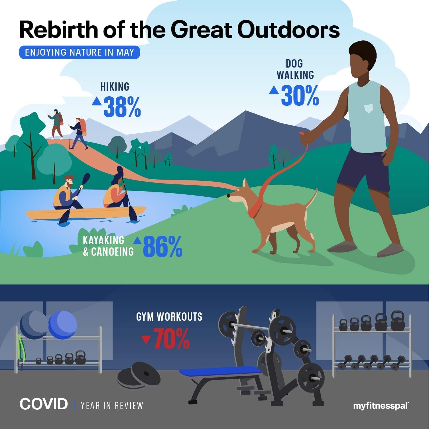 To stay safe following the closing of gyms and other recreational facilities, there was a huge influx in logging outdoor, socially-distant workouts such as kayaking/canoeing, hiking and dog walking, whereas in-studio gym workouts crashed.