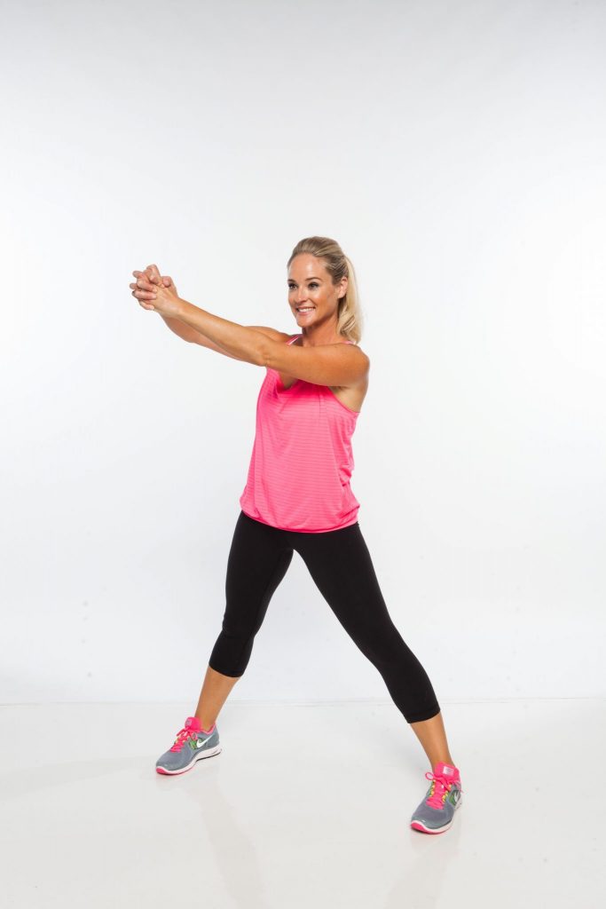 1. Stand with feet wider than hips (about 3 feet apart), with hands clasped and abs drawn in tight. Shift weight into right leg, bending knee and sitting back into hips as arms swing down and across right hip, tracing a circle from back to front.