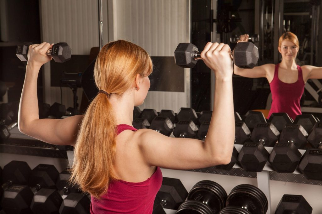 - Bring your arms up to shoulder level, engage your core, and then press the weights up.