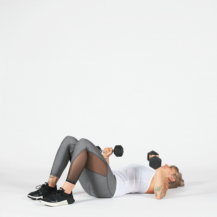 The move: Grab two dumbbells and safely lay on the ground. Press both bells up toward the ceiling, then lower them down, stopping just before your elbows touch the floor and repeat.