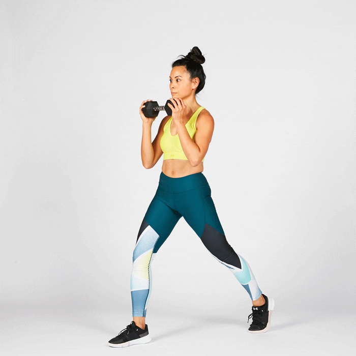 The move: Begin in a split stance with about a foot of space laterally between your left and right foot. Holding the dumbbells in your hands, maintain a strong, solid posture. Bend both knees to 90 degrees, engage the glutes and press up off of the floor.