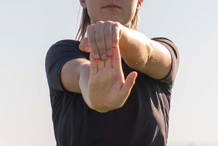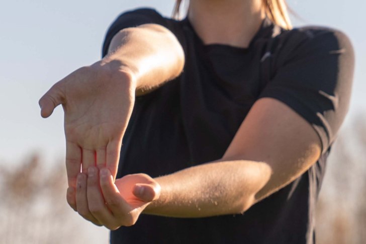 Stretch the affected arm straight out in front of you, but this time keep your forearm and palm facing down. With your other hand, grab your extended hand and slowly pull it down and toward you. Just as you did in the wrist flexor, only bend at the wrist so the rest of your arm stays straight. You should feel the stretch on the top of your arm. Hold the stretch for five seconds then release. Repeat two to four times and then do the exercise on the other side if needed.