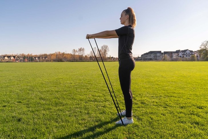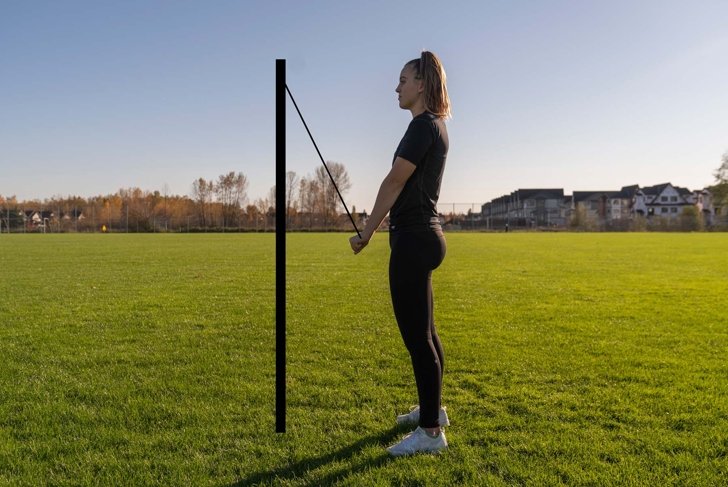 Grab the resistance band handle with your palm facing down and your arm resting at your side. Step on the other end of the band with the same foot, stepping the opposite foot forward. Lift your hand, curling your arm toward your shoulder, then lower back down. Do three sets of ten. Repeat with your palm facing upward.